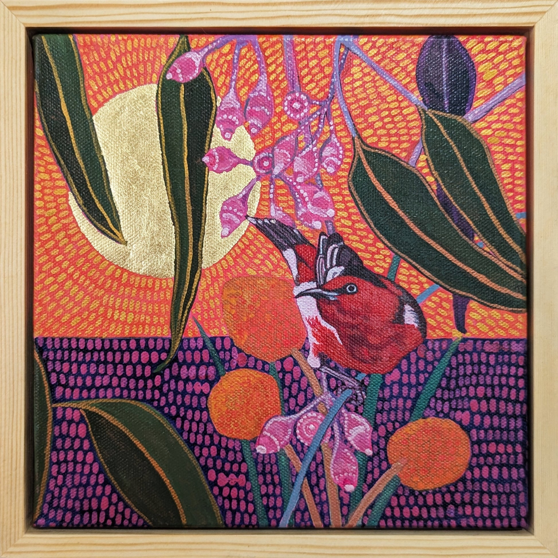 Medium: Watercolour mixed media gold leaf on canvas framed in a varnished deep pine float frame